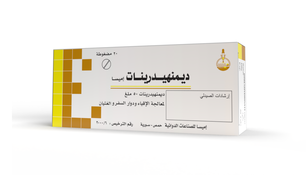التركيب: كل مضغوطة ديمنهيدرينات إميسا يحوي 50 ملغ ديمنهيدرينات.