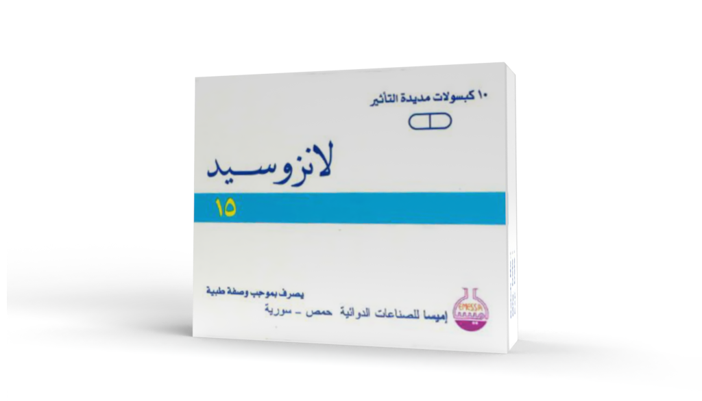 عبوة كرتونية تحوي 30 كبسولة من لانزوسيد 15 ملغ.